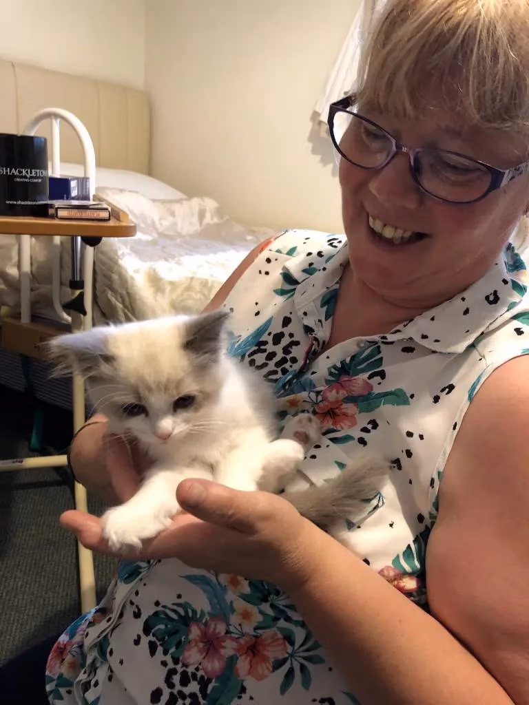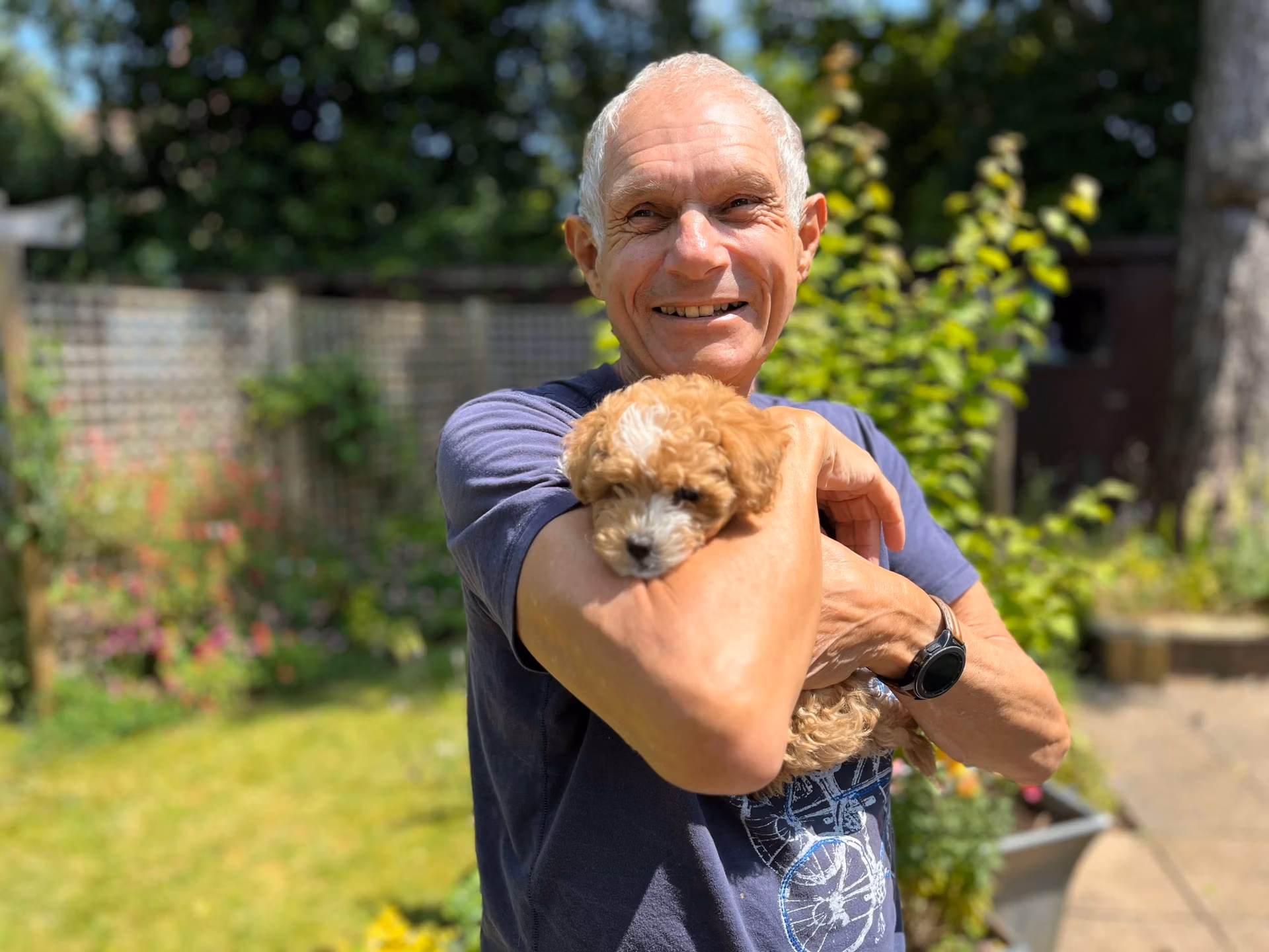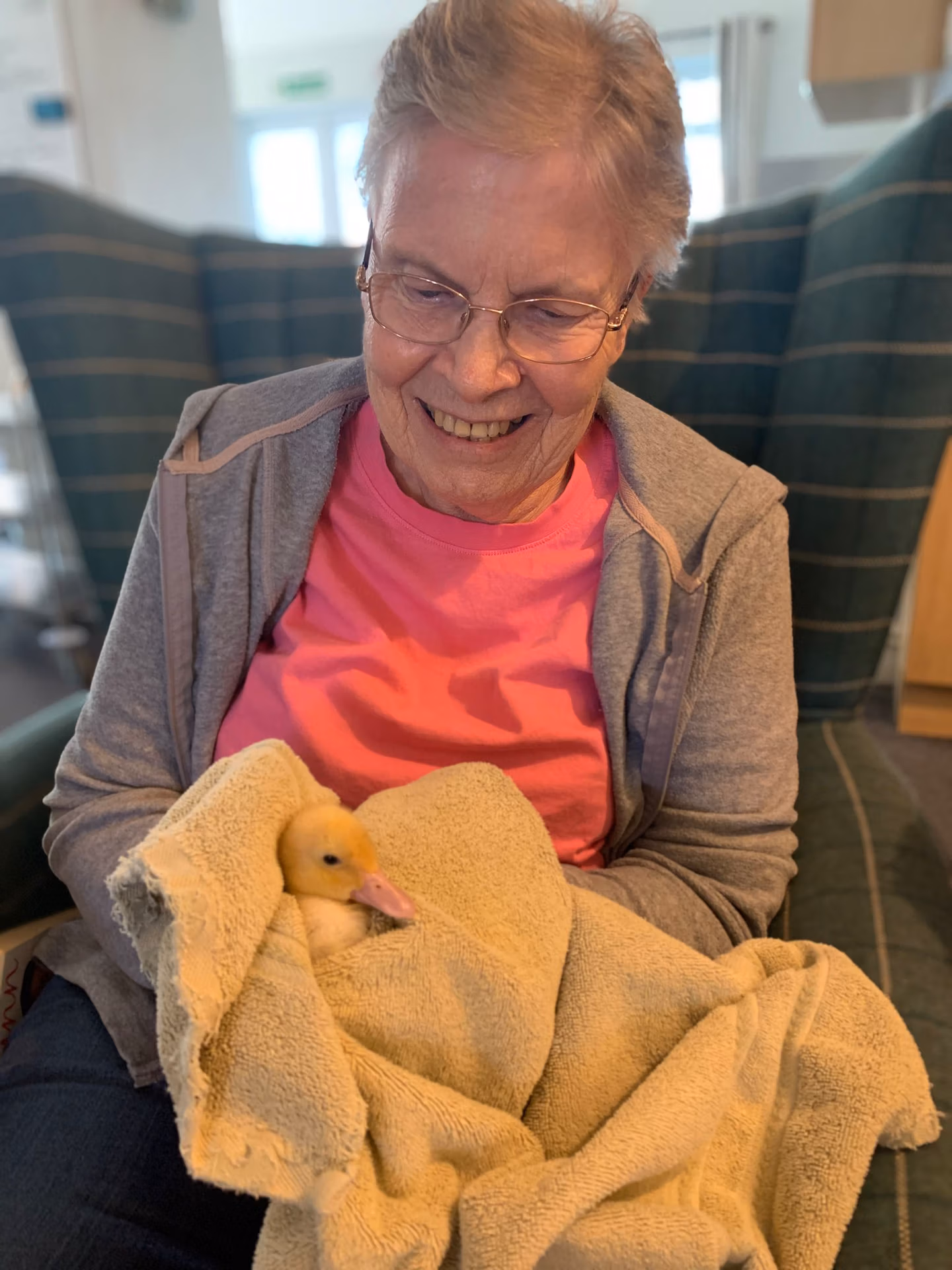 A small puppy meeting a resident at Richmondwood Care home in Bournemouth