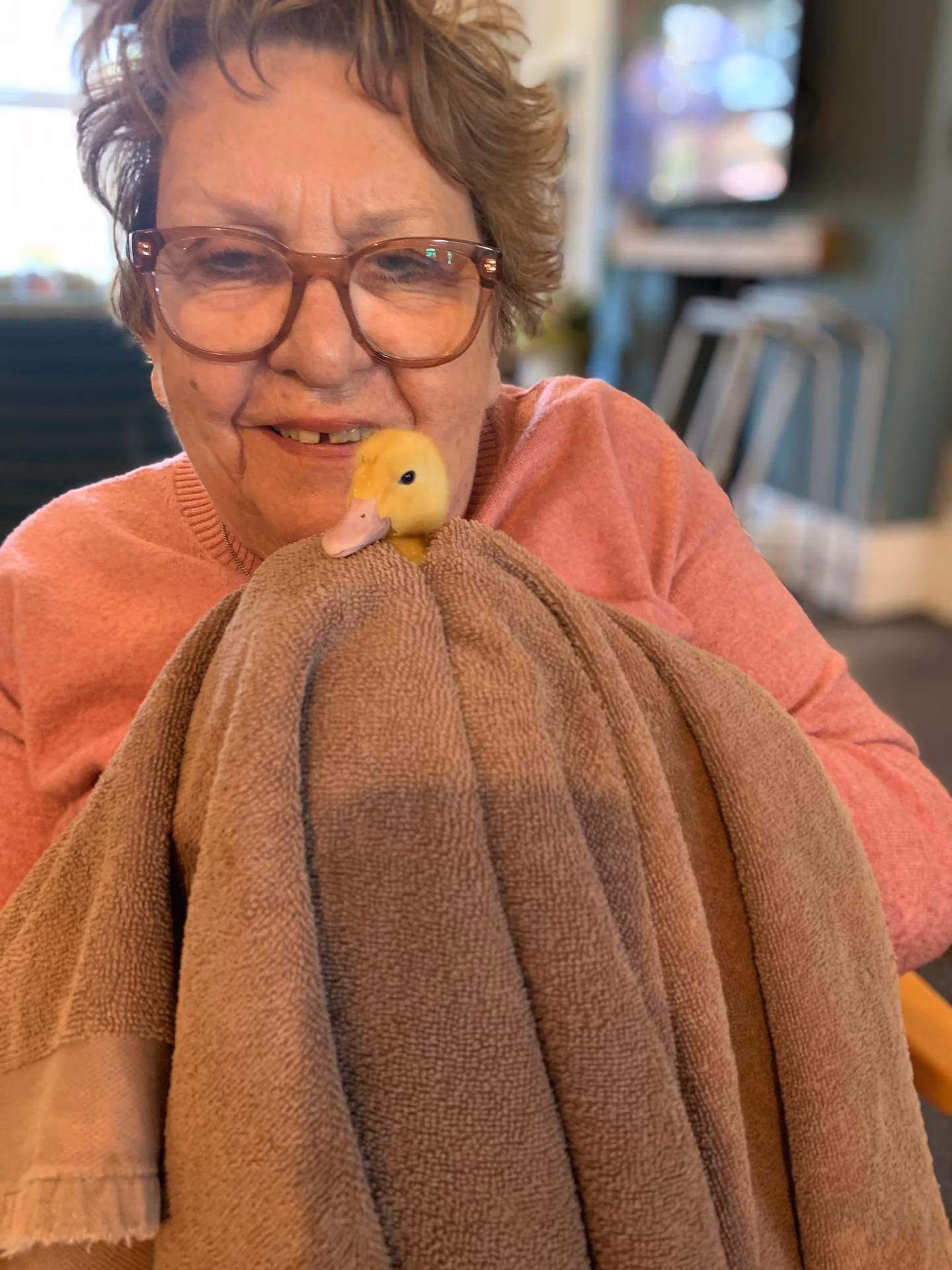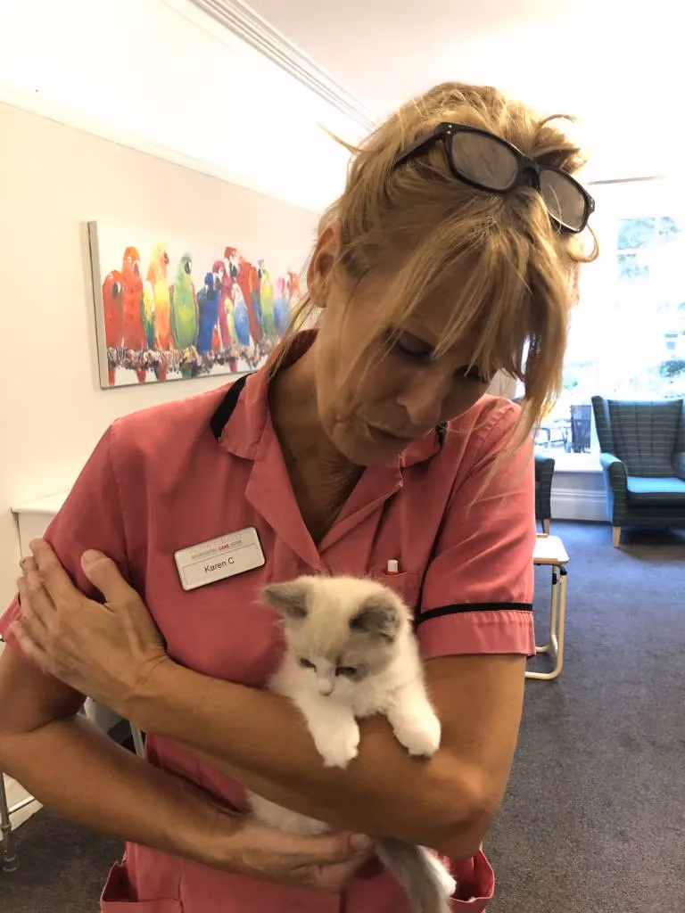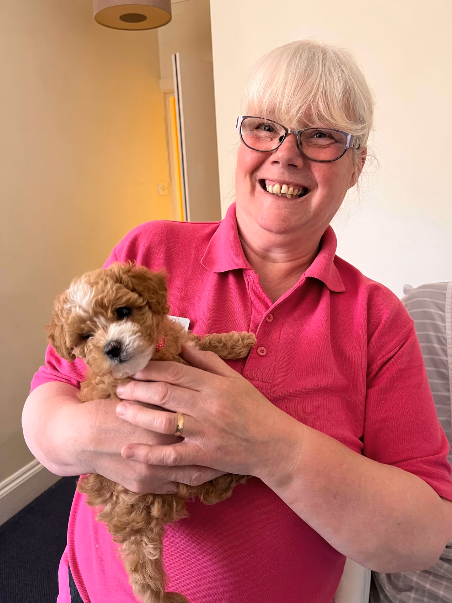 One of the Richmondwood Care Home staff playing with a casting puppy